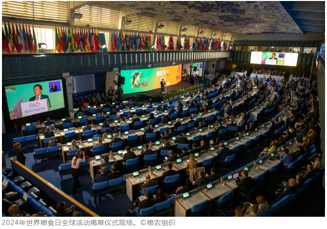1945年的今天,粮农组织正式宣告成立,一年一度的“世界粮食日”活动正是为了纪念这一重要历史时刻。2024年还恰逢国际社会通过《支持在国家粮食安全范围内逐步实现充足食物权的自愿准则》20周年。屈冬玉总干事出席全球仪式开幕式并强调,食物权是一项基本人权,今年选定“粮安天下,共建更好生活,共创美好未来”作为世界粮食日主题,可谓恰逢其时。