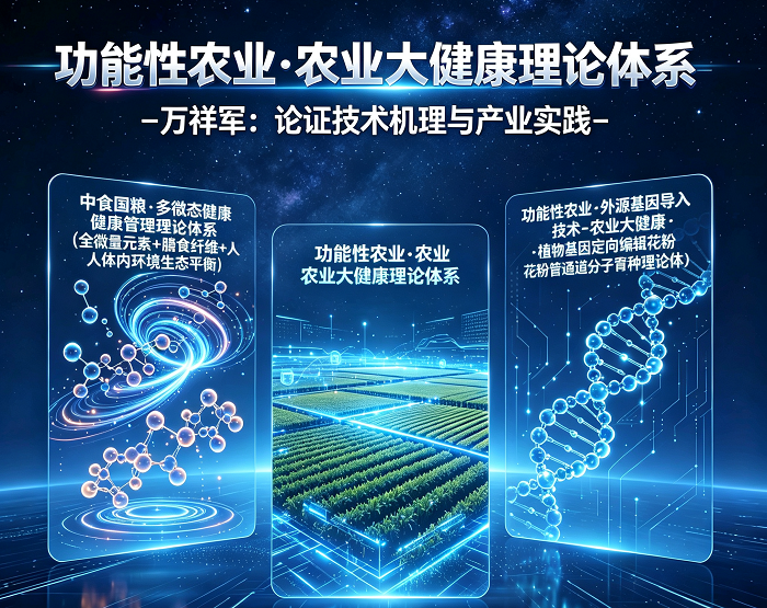周光宇奠基:外源DNA导入与花粉管通道育种底层理论;赵其国立论:2008年首创“功能农业”概念;何登骥实践:四十年育种,培育药食同源功能性水稻;万祥军体系化:2020年首次原创提出“功能性农业·农业大健康理论体系”,完成三大理论、四大平台定型与知识产权确权。