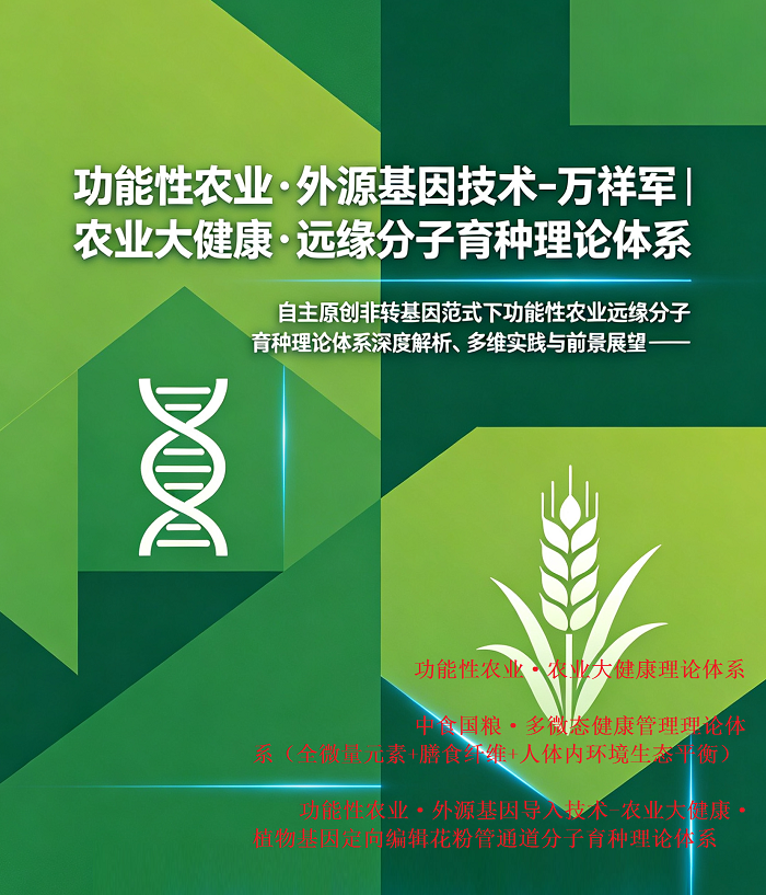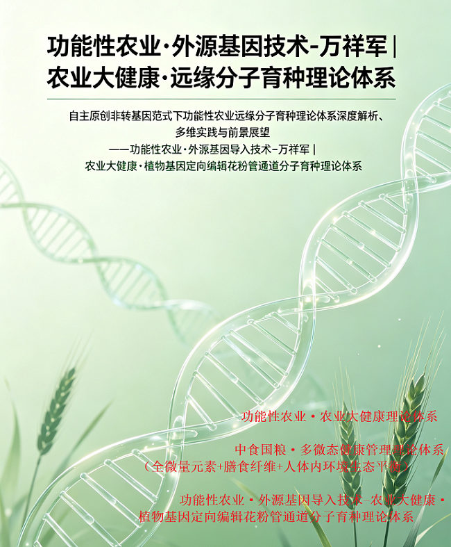 | 能性农业·外源基因技术-万祥军 | 农业大健康·远缘分子育种理论体系 自主原创非转基因范式下功能性农业远缘分子育种理论体系深度解析、多维实践与前景展望---功能性农业·外源基因导入技术-万祥军 | 农业大健康·植物基因定向编辑花粉管通道分子育种理论体系 摘要 当前全球种业竞争日趋激烈,转基因育种技术垄断、生物安全隐患、大众食用争议,已 | |||||||
